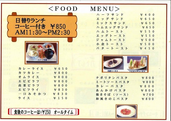 | 日替りランチ コーヒー付き 850円 AM 11:30 ~ PM 2:30 |