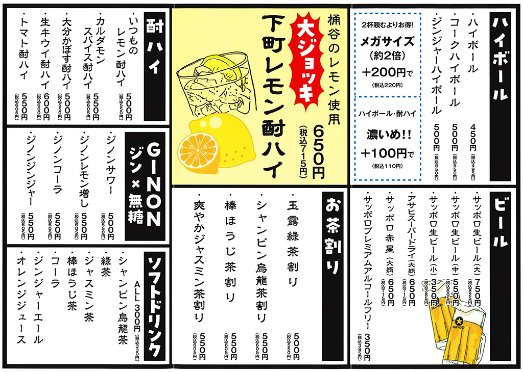 | 下町レモン酎ハイ(大ジョッキ) | 650円 | 税込715円 |
