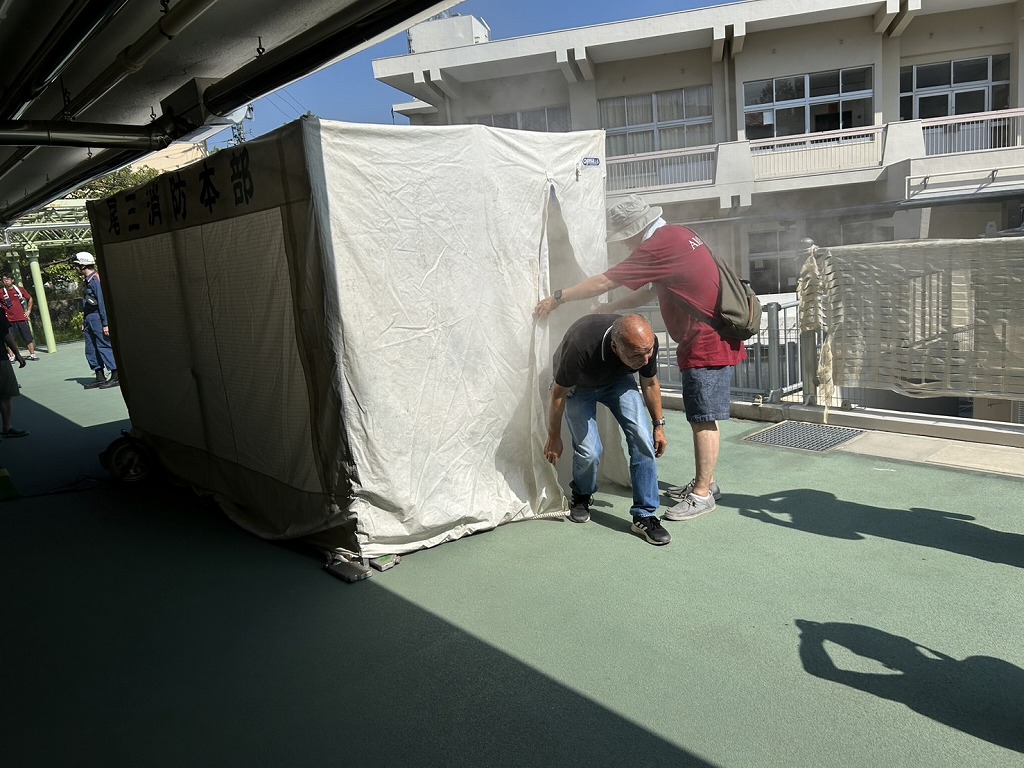 訓練用の消火器を実際に操作して消火活動を学び、 煙体験ハウスの中で、火災時の避難状況を疑似体験する訓練を行いました。