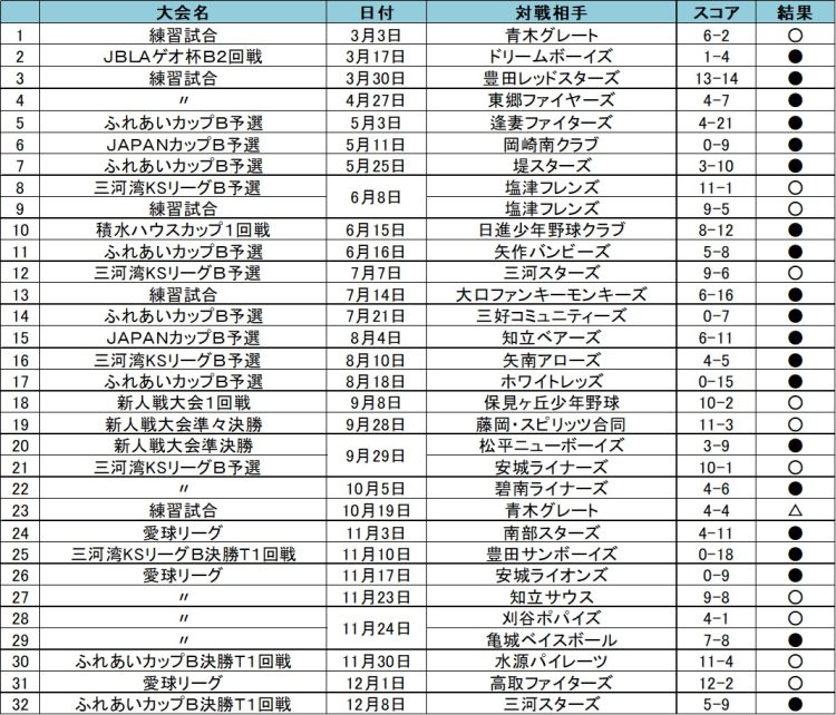 練習試合 6試合 2勝 3敗1分け 勝率0.333
