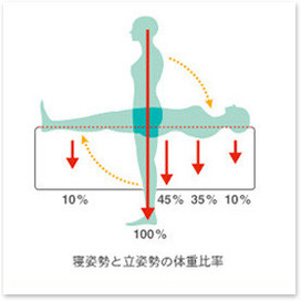 しかし高反発フォームの場合は、低反発フォームと同様体圧によって一度は沈みますが、すぐに体圧を均一に分散させて押し上げる力が働くので、しっかりと身体全体をホールドし、包み上げてくれるのです。腰のくびれ部分を持ち上げるので指圧効果があり、血流の促進にもなります。この力強さが、横たわった身体の形にいつも完全に対応し、不自然な姿勢を一切強いることなく支え続けるという最適な体圧分散を実現する訳です。軟らかすぎず硬すぎない、理想的な弾力性と復元性を持つ究極の素材、それが高反発フォーム<エリオセル>なのです。 |