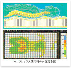 スプリングの入っていないポリウレタンフォームの<エリオセル>を芯材とするマニフレックスは、水平状態から最大70度程度まで曲げることが可能。上半身が起こせるタイプの介護用ベッドにもご使用いただけます。しかも理想の寝姿勢が得られることで、腰や背中の疲労回復、特に脊柱に関係する病気改善の補助にもなります。 |