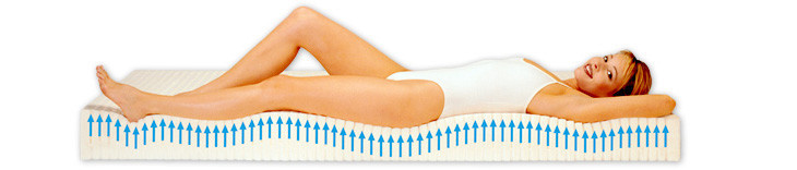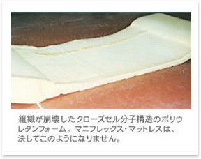 一般のポリウレタンフォームはクローズセル分子構造なので、強い圧力が度重なると、その組織は崩壊してしまいます。残念ながら、一度組織の崩れたポリウレタンフォームは、二度と膨らみません。また、クローズセル分子構造のポリウレタンフォームは空気や水を通しにくく、汗がたまり、ムレます。更に、クローズセルは温度に弱いので、日本のような四季のはっきりした国では、冬はカチカチ、夏はグニャグニャといった硬度変化に悩まされる場合もあります。マニフレックスなら、このような問題は全て解消します。 |