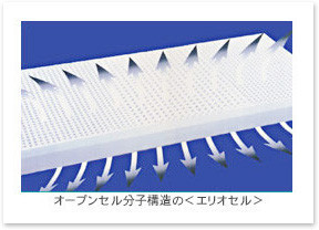 一般のポリウレタンフォームはクローズセル分子構造なので、強い圧力が度重なると、その組織は崩壊してしまいます。残念ながら、一度組織の崩れたポリウレタンフォームは、二度と膨らみません。また、クローズセル分子構造のポリウレタンフォームは空気や水を通しにくく、汗がたまり、ムレます。 |
