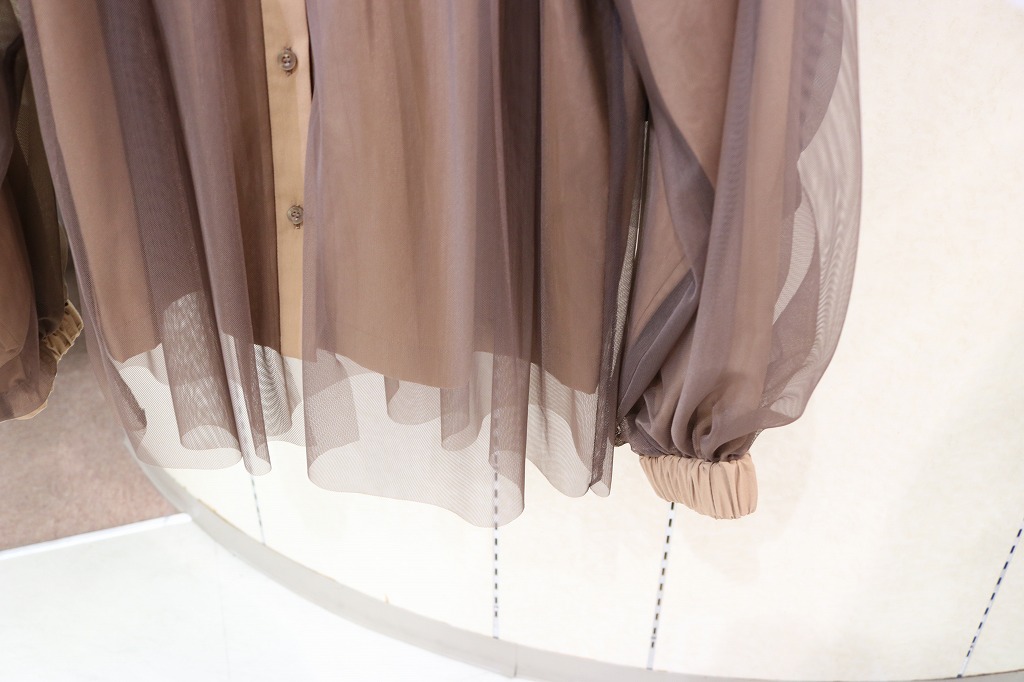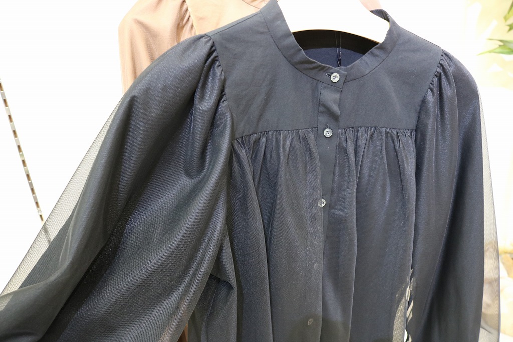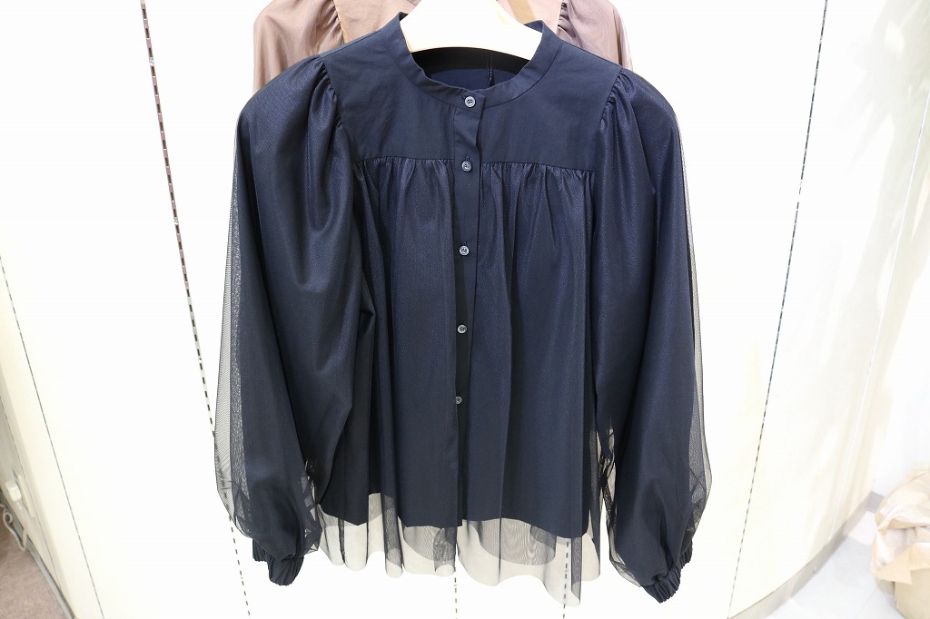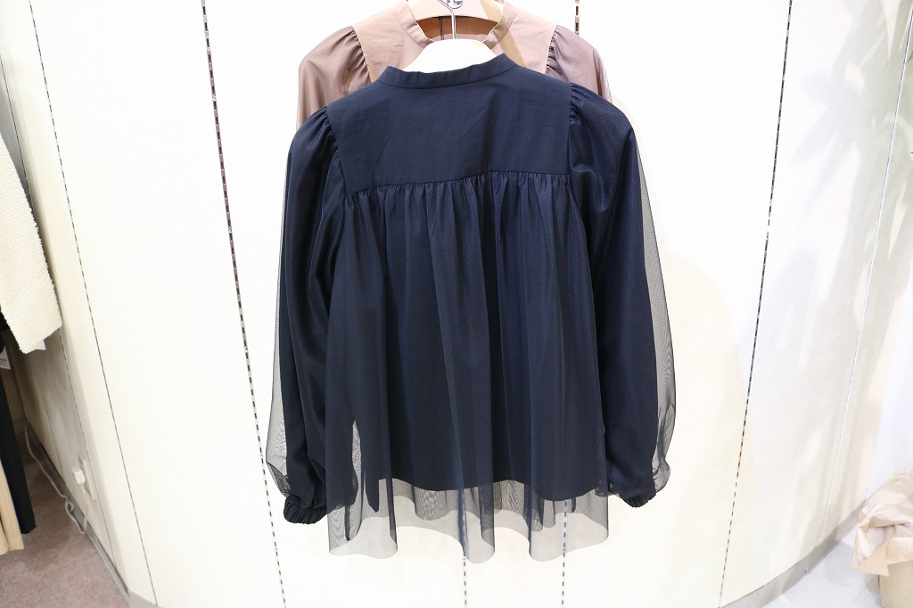 身頃と袖にチュールを重ねた女性らしいキャッチーなブラウス パンツと合わせてタックアウトで着こなすのがオススメ