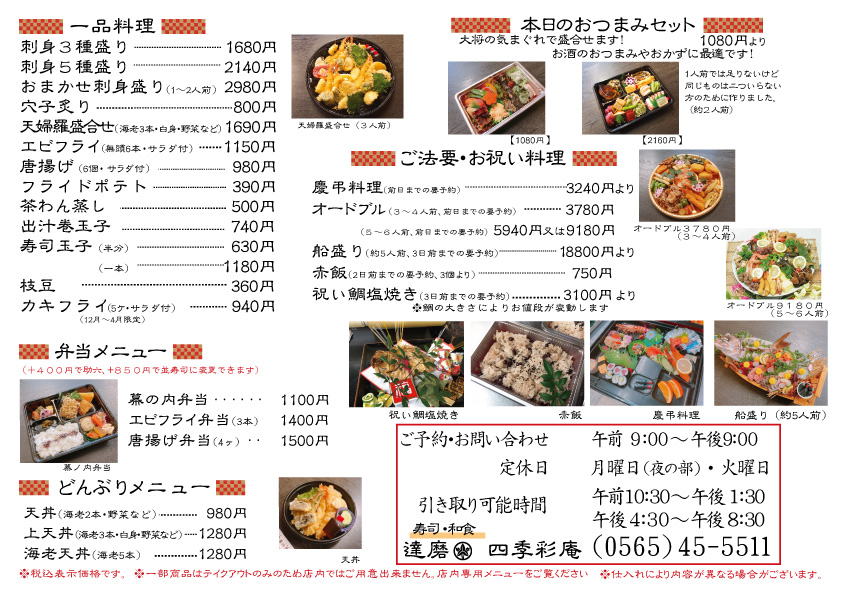 ※平日夜の部の営業は、来店・テイクアウト共に当日の昼の部までにご予約がない場合は早めに閉店する場合がございます。 -