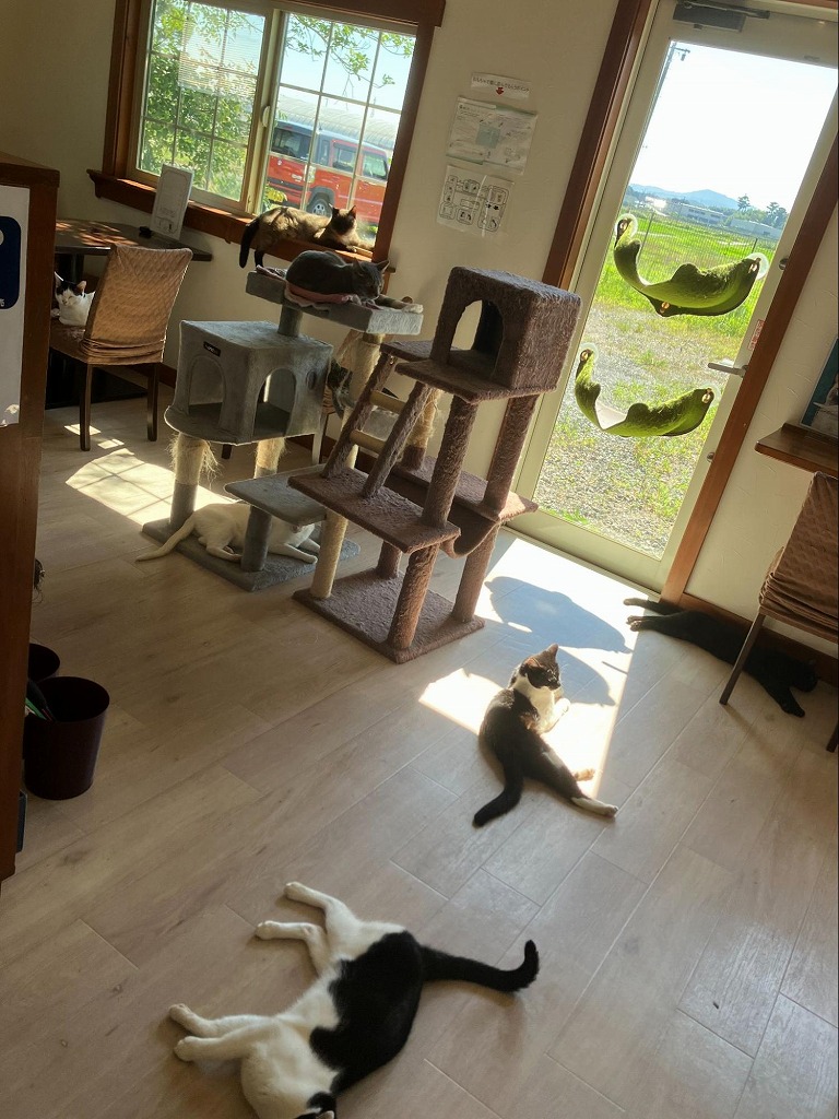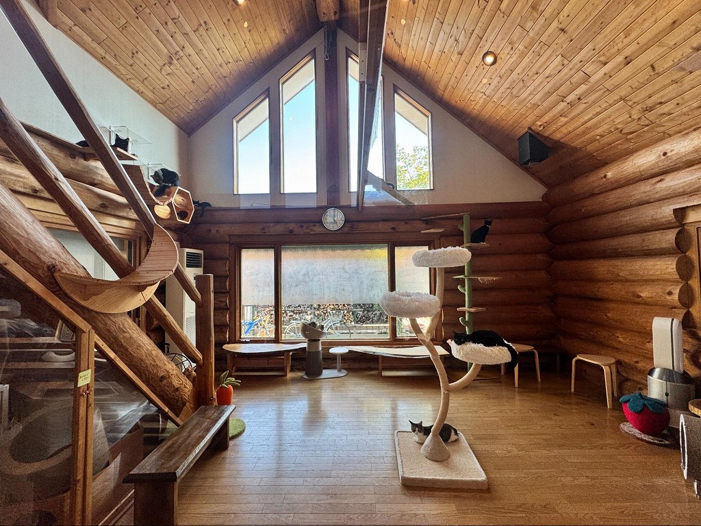 店内には、猫たちがのびのび過ごせるよう工夫されたインテリアが広がり、清潔感のある空間にはキャットウォークやタワーなどの猫らしい遊び場も充実。すり寄ってくる甘えん坊やちょっと控えめな子、性格もさまざま。気ままにくつろぐ猫たちのリラックスした姿に癒されます。