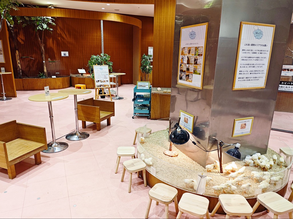 東郷町のららぽーと愛知東郷3階にある「Moff animal cafe」は、約40種類もの動物たちとふれあえる癒しのアニマルテーマパーク。ヒヨコやモルモット、うさぎなどの小動物から、ナマケモノやフラミンゴ、カピバラといった珍しい動物まで、個性豊かな仲間たちがのびのびと過ごしています。