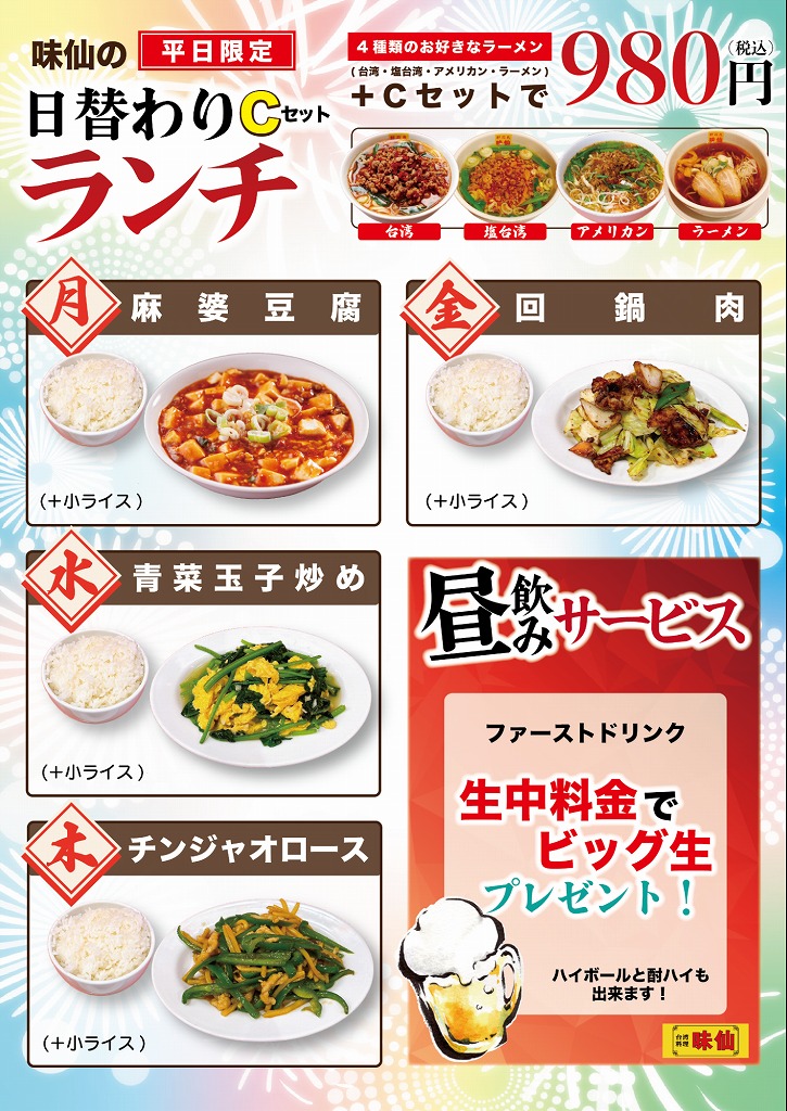 日替わりのランチセットは、お好きなラーメンに麻婆豆腐やチンジャオロースなど中華の人気メニューとライスもついて980円(税込)。お昼からがっつり派も大満足のランチセットです。