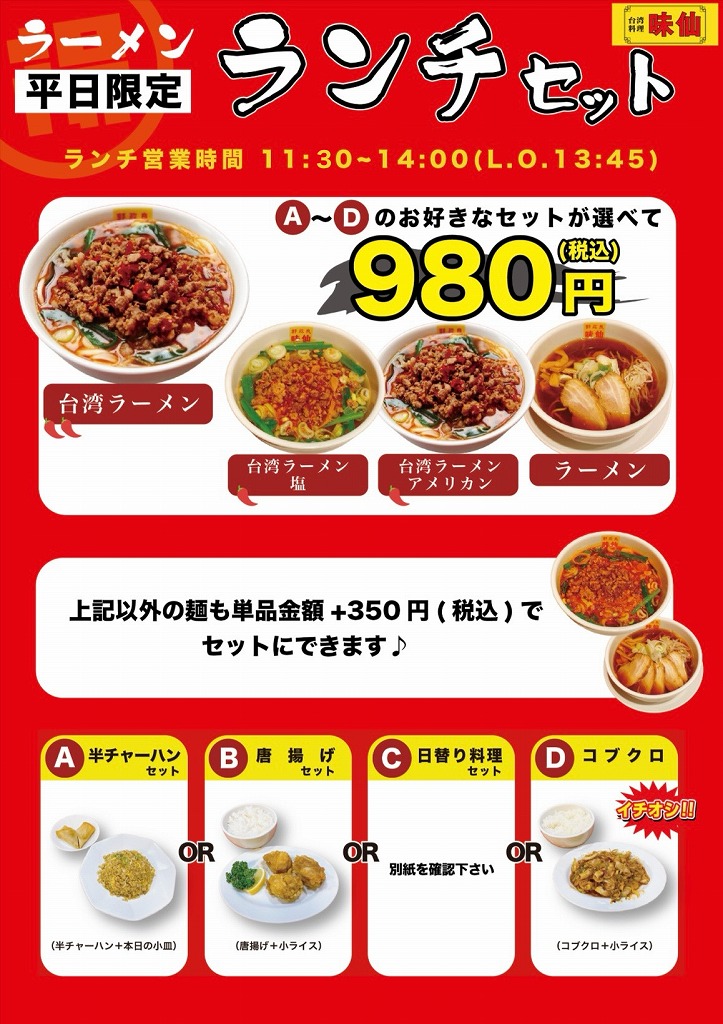 人気のランチは、お好きなラーメンにチャーハンやから揚げ、ライスなどお好きな組み合わせでボリュームも満点の平日限定「ラーメンランチセット」。ラーメンは4種類から選べるスタイルで、そのほかの麺もプラス350円(税込)で選択可能です。