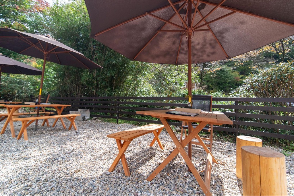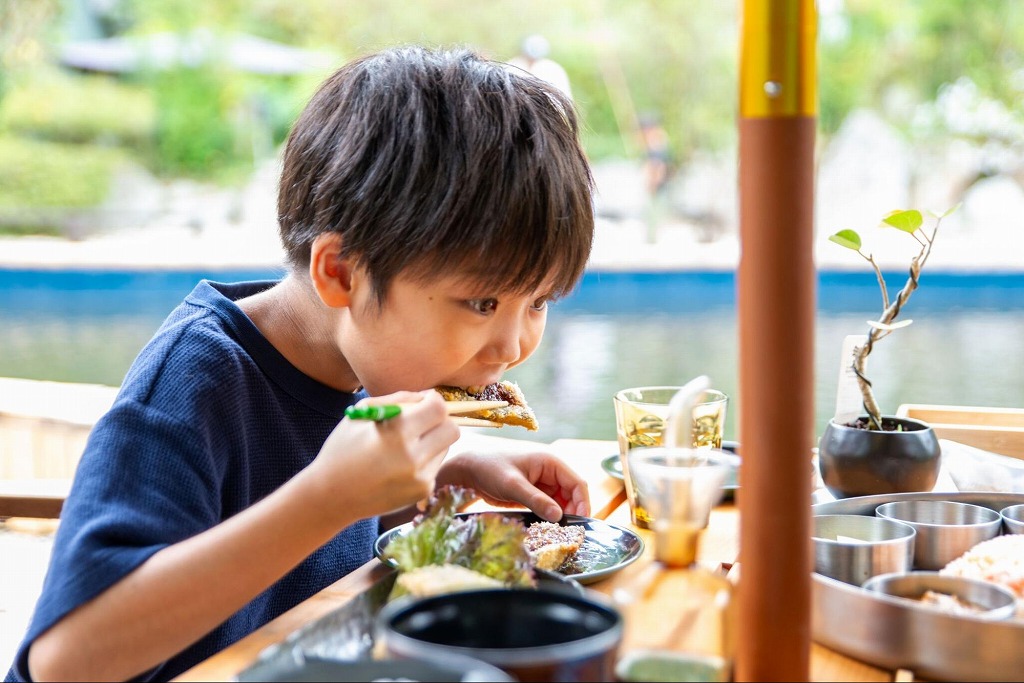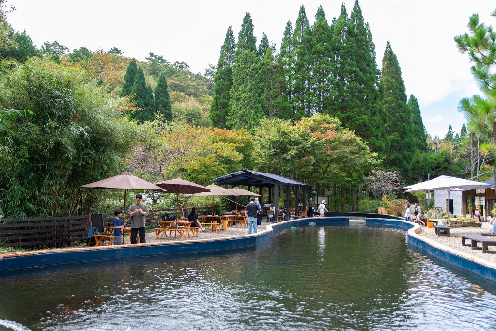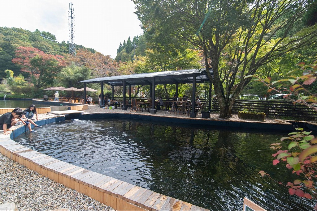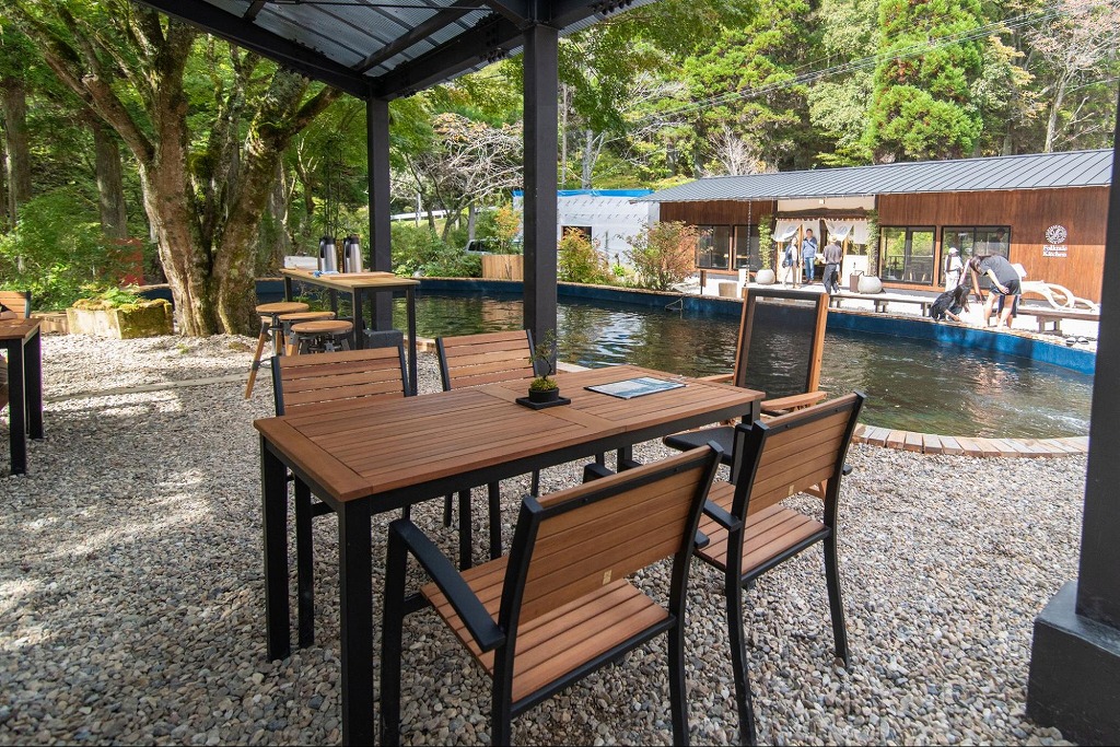 池のまわりには、ゆったり過ごせるダイニングスペースが確保されていて、釣りや水遊びの合間にひと休みするのにもぴったり。食事もそのまま屋外の席でも店内でも可能。自然を満喫しながらゆっくり過ごせます。