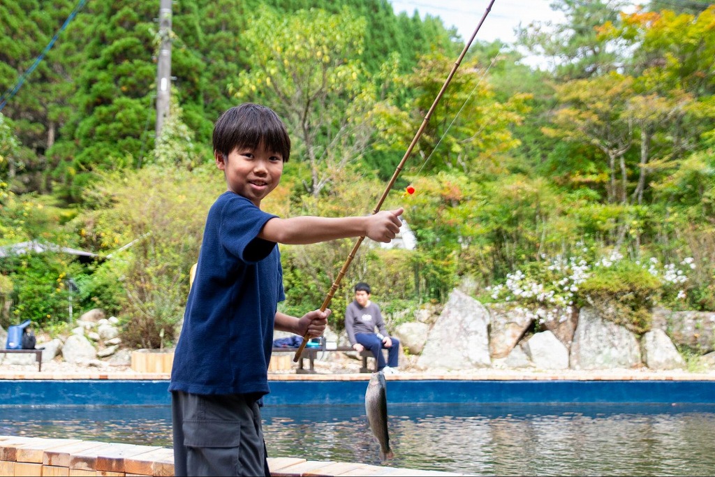 釣り堀では、初心者やお子さんでも簡単に釣れる「ゆずマス」などを放流。地元産のゆずを練り込んだ特製エサで育てられた清流育ちの白身魚は、お刺身でも美味しく味わえると好評です。つかみ取り体験もあり、家族やグループでの思い出づくりにぴったりのアクティビティです。