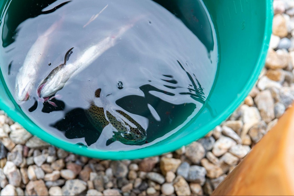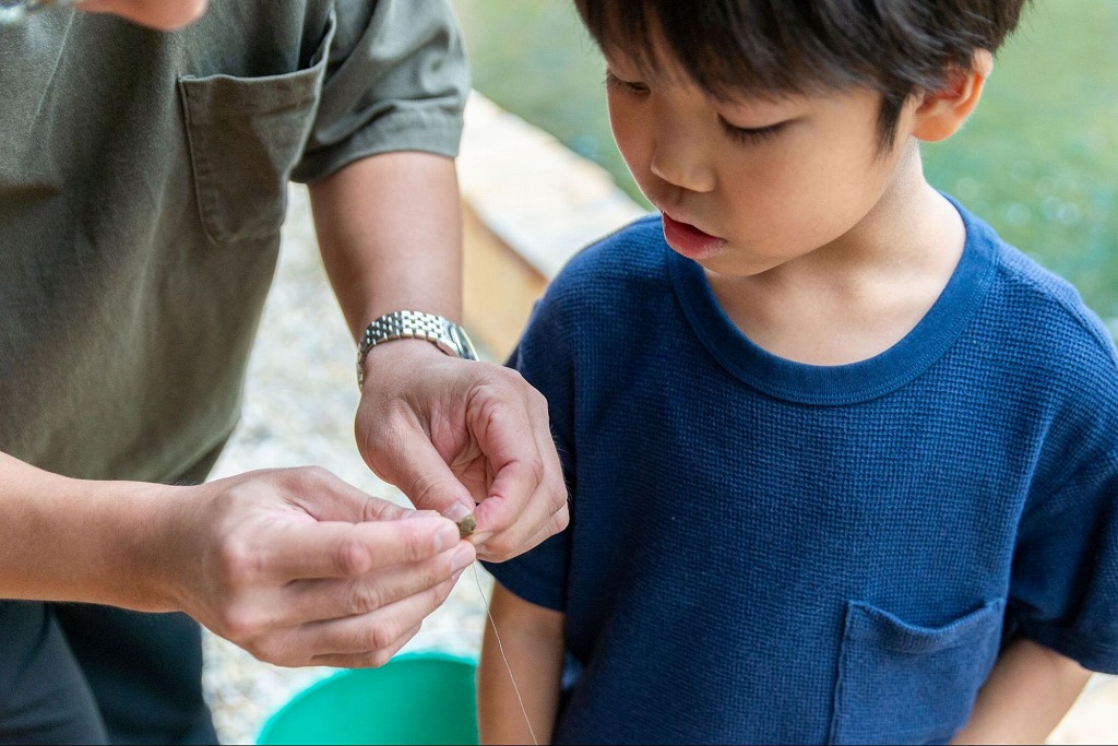 いよいよ釣り体験のスタートです。竿をそっと水面に垂らすと、すぐにピクピクッと反応が。初心者でも驚くほど簡単に釣れました。自然の中で気軽に楽しめる、うれしい体験です。