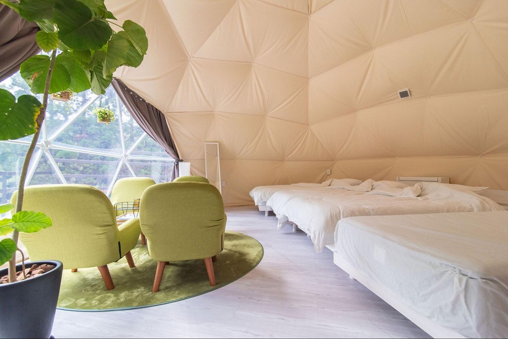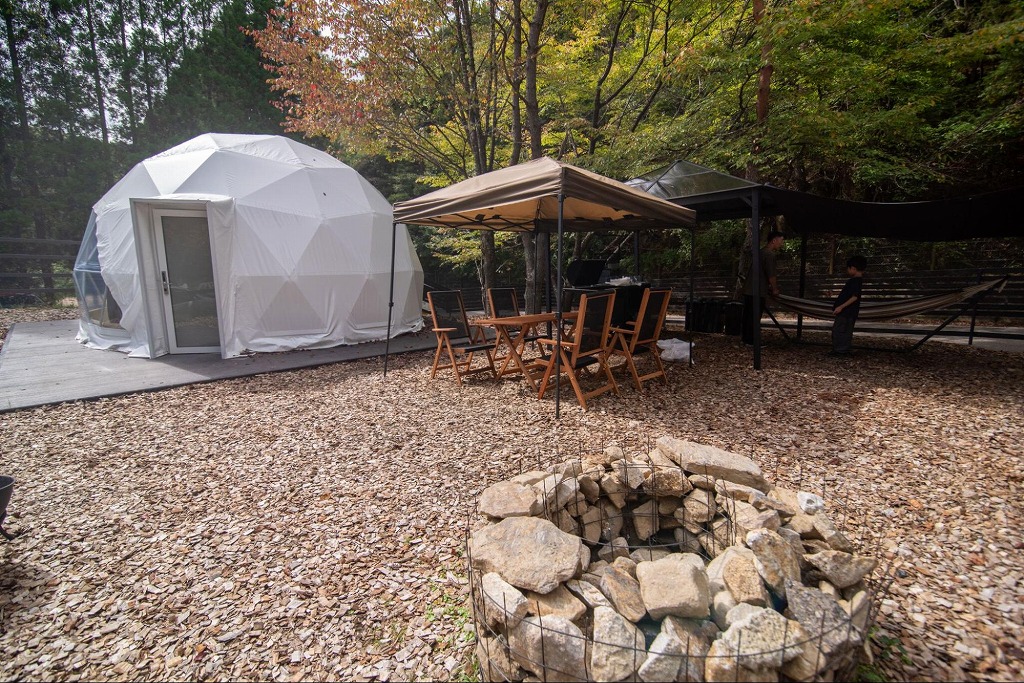 グランピングドームには、冷蔵庫や電子レンジも付いていておしゃれで快適な空間。屋外には、水回り設備の整ったバーベキュースペースやダイニングスペースもあります。ペットも同伴可能で、季節を問わず楽しめます。