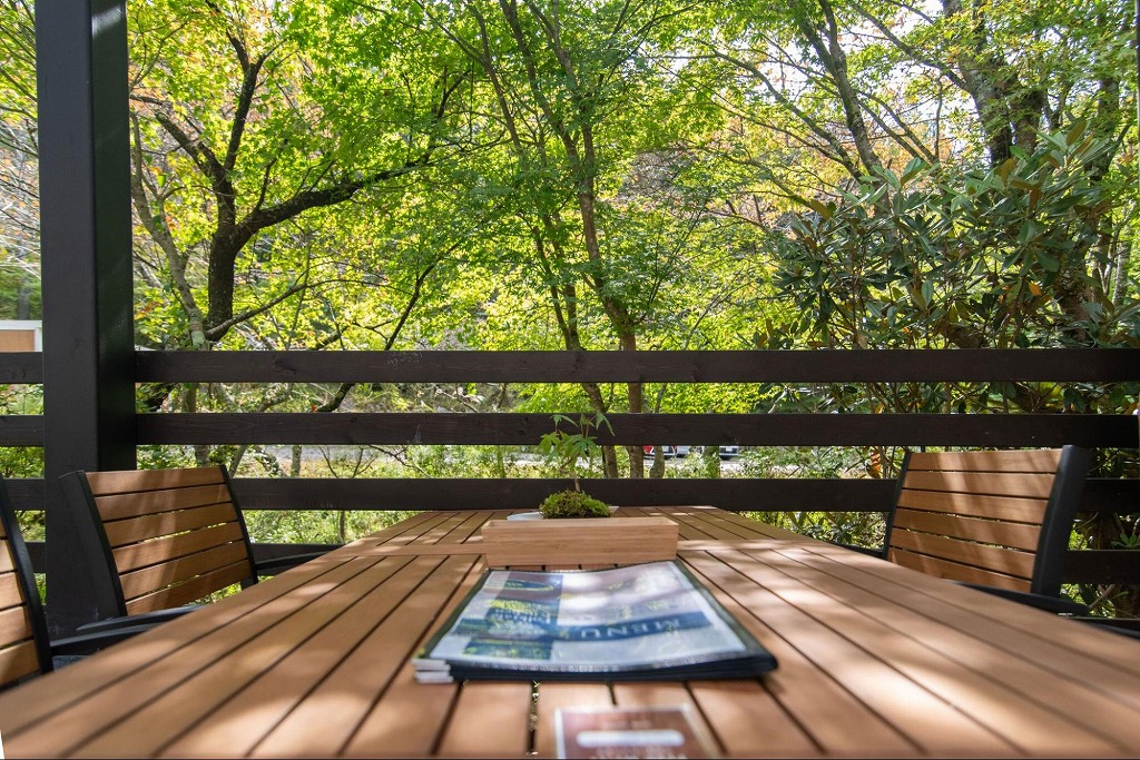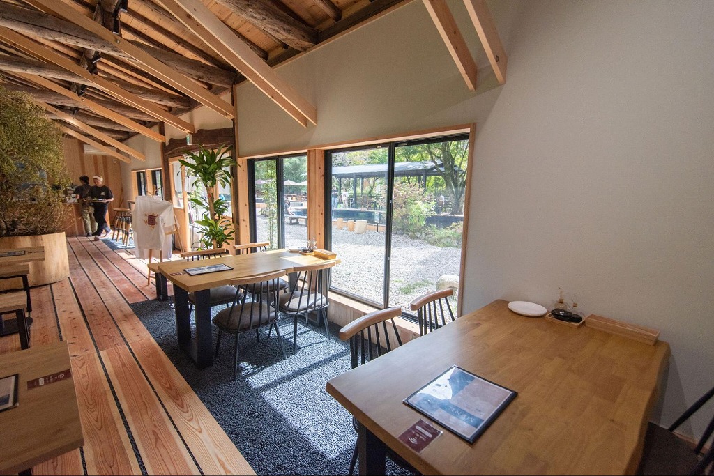 「Folktale Kitchen(フォークテイルキッチン)」の店内は、木材を基調とした素朴であたたかみのある空間。大きな窓から自然光が差し込み、森の緑を眺めながら、ゆったりとした時間が流れます。池の目の前にあり、水辺のアクティビティのあとにそのまま立ち寄れる気軽さも魅力です。