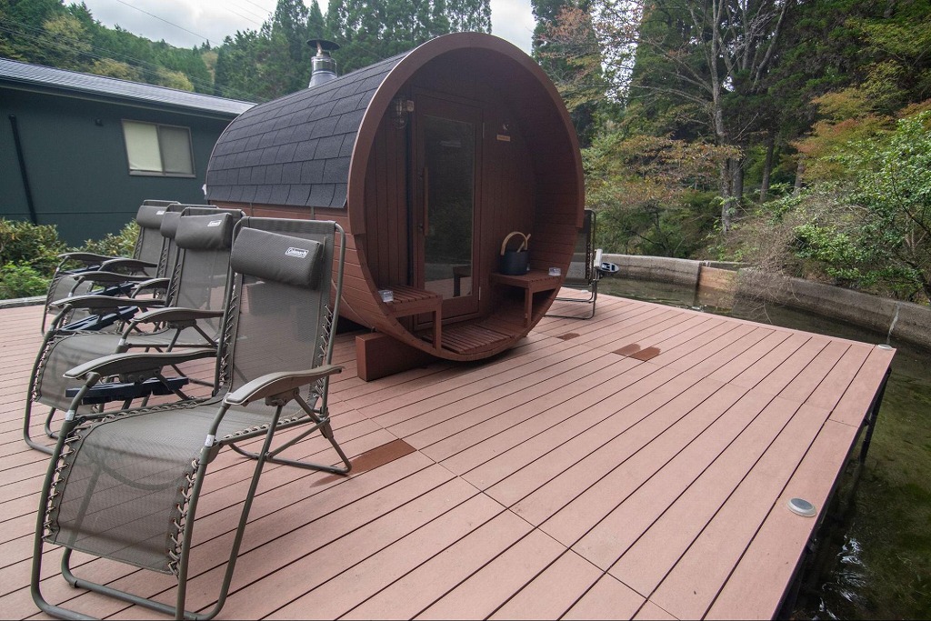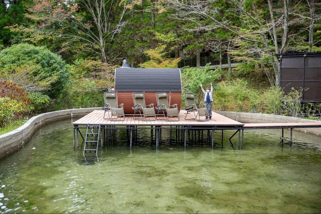 サウナでしっかり温まったら、水風呂…ではなく、そのまま階段を降り池へ。森の空気と冷たい水が全身を包み込む、「互いの森PARK」ならではのアウトドアサウナ体験。自然と一体になるととのいは、ここでしか味わえない特別な体験です。