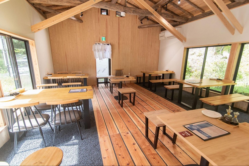 地元で獲れたシカやイノシシなど、自然の恵みを活かしたジビエ料理を提供予定で、ただいまオープンに向けて準備中です(2025年10月現在)。1階は開放感あふれるカフェスペース、2階には座敷の個室があり、ペット同伴OKの屋外席も。古民家ならではの落ち着いた雰囲気の中で、ゆったりと食事や会話が楽しめそうですね。