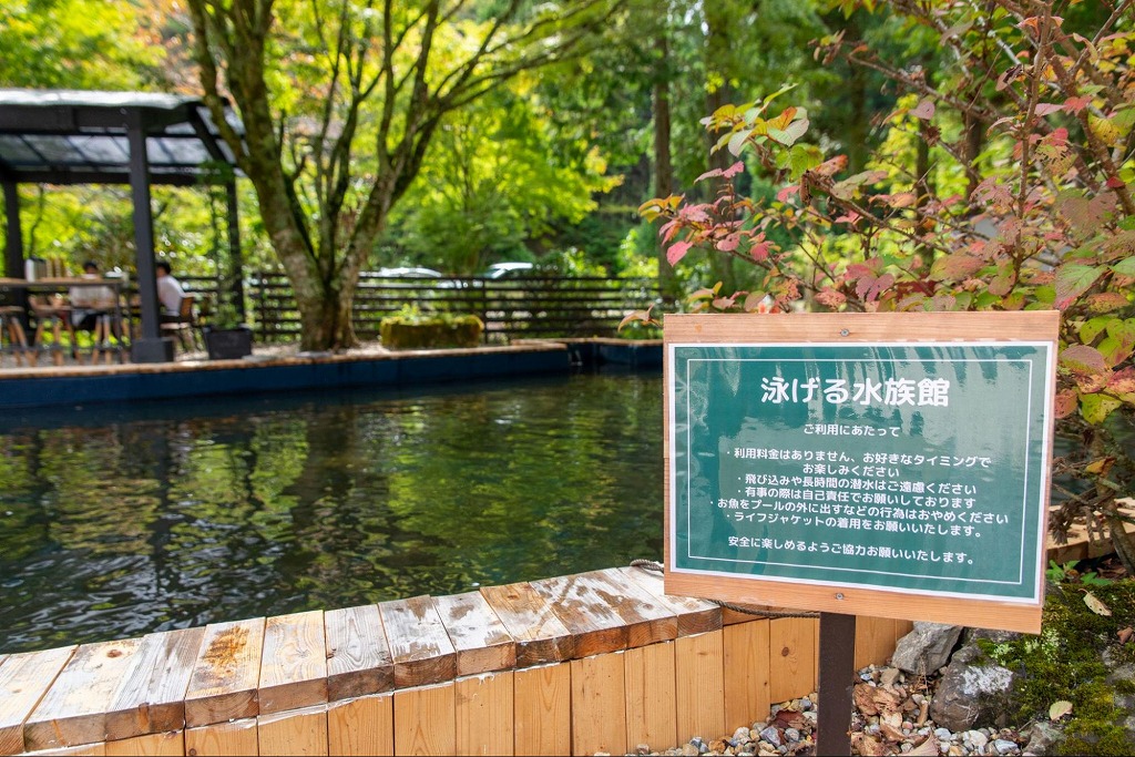 釣り堀直結の「泳げる水族館」。取材日は秋のはじまりということもあり、少し肌寒さも感じる気候でしたが、ちらほらと魚たちと水遊びを楽しむ姿も見られ、のんびりした空気が流れていました。