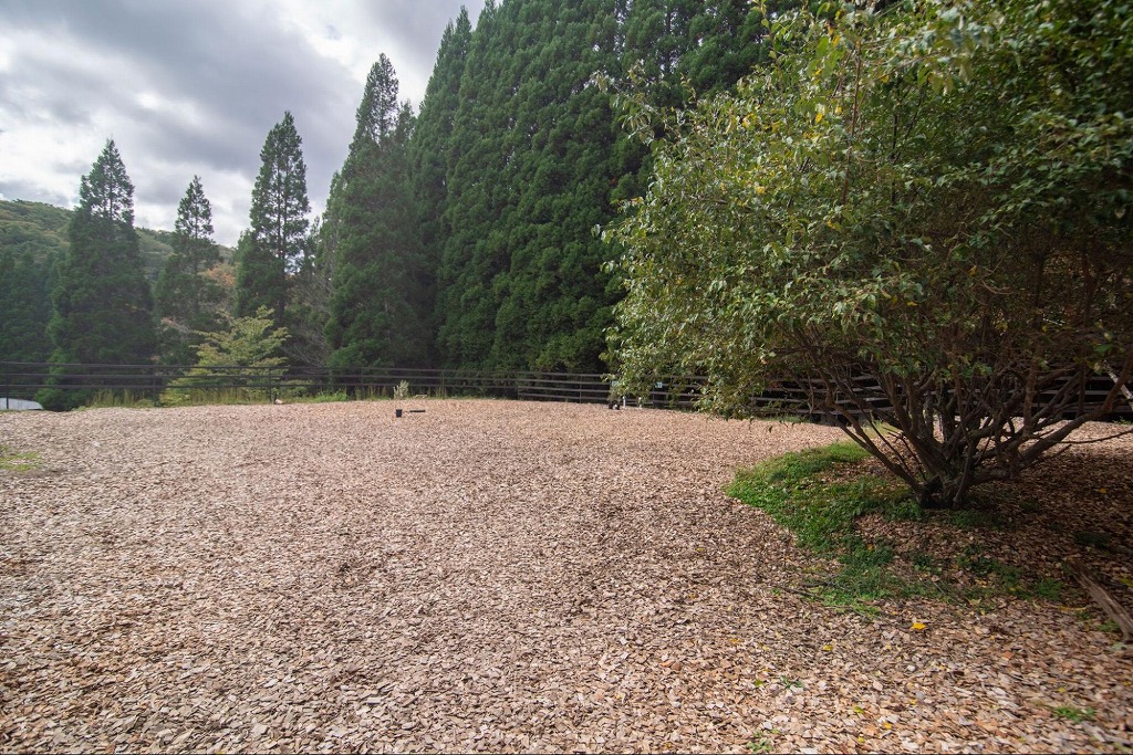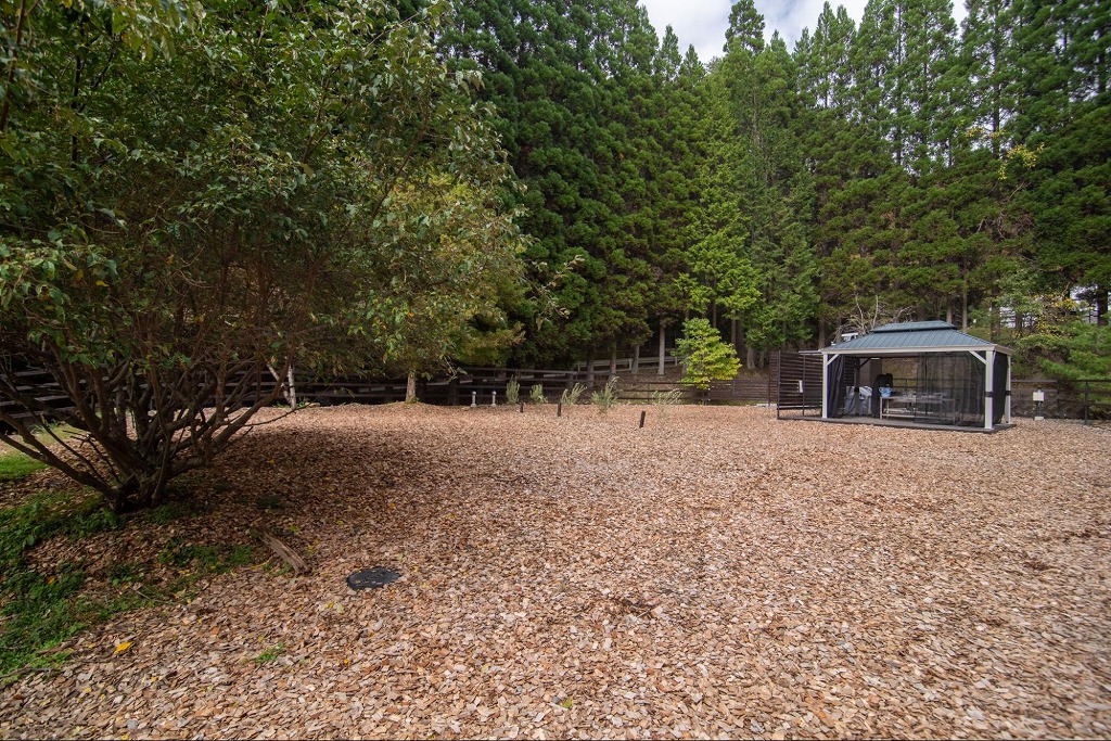 テントサイトはウッドチップ敷きで整備され、地面の硬さや湿気を気にせず快適に過ごせるのが魅力です。