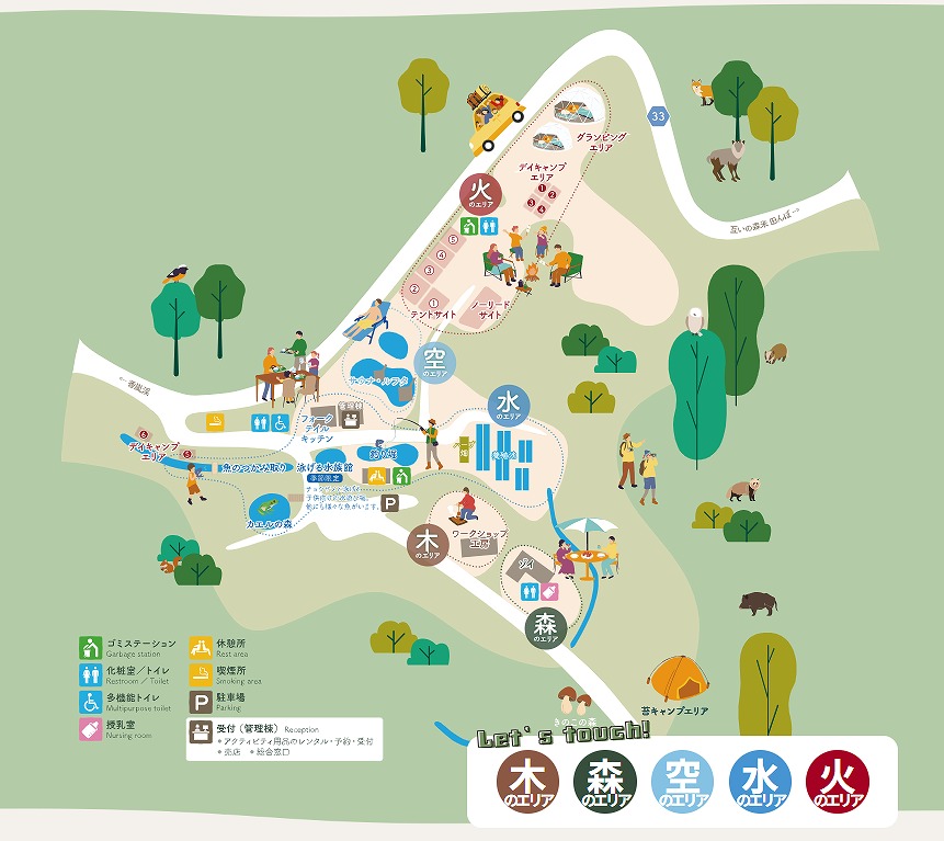 「互いの森PARK」は、自然の中で五感をフルにつかって楽しめる体験型フィールド。子どもから大人まで誰もが夢中になれる、水・空・火・森・木の5つのエリアが広がり、それぞれの場所で、それぞれの時間がゆったりと流れています。