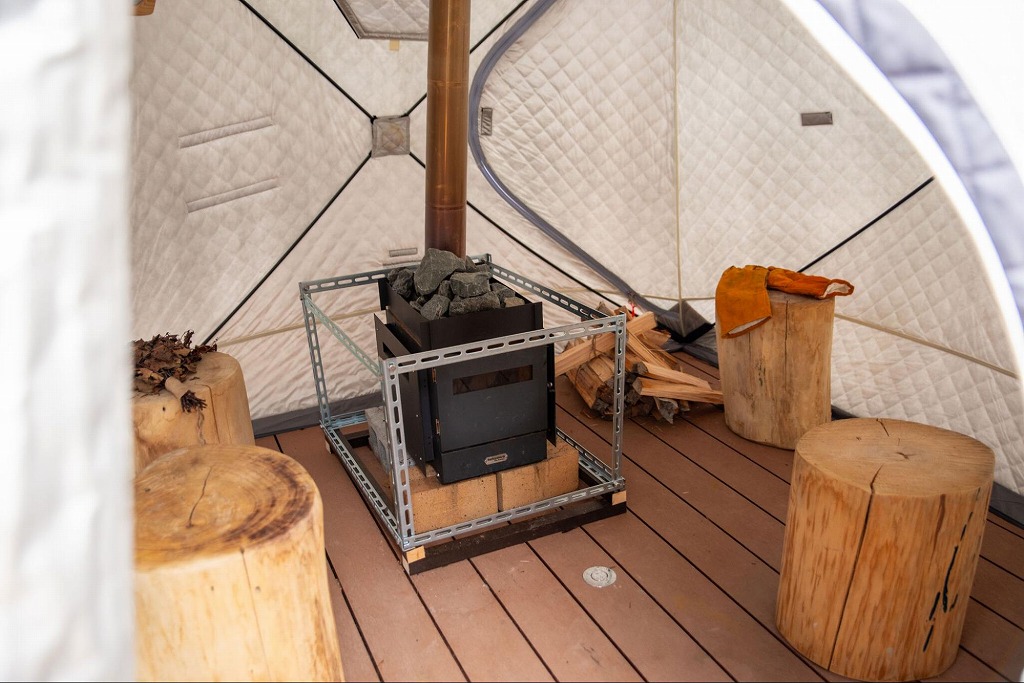 空のエリアでは、水上に佇むテントサウナで大空を見上げながら、自然の中で心身ともに整うひとときを楽しめます。美しい景色を眺めながら、究極のリフレッシュタイムを堪能できる癒しの場所です。