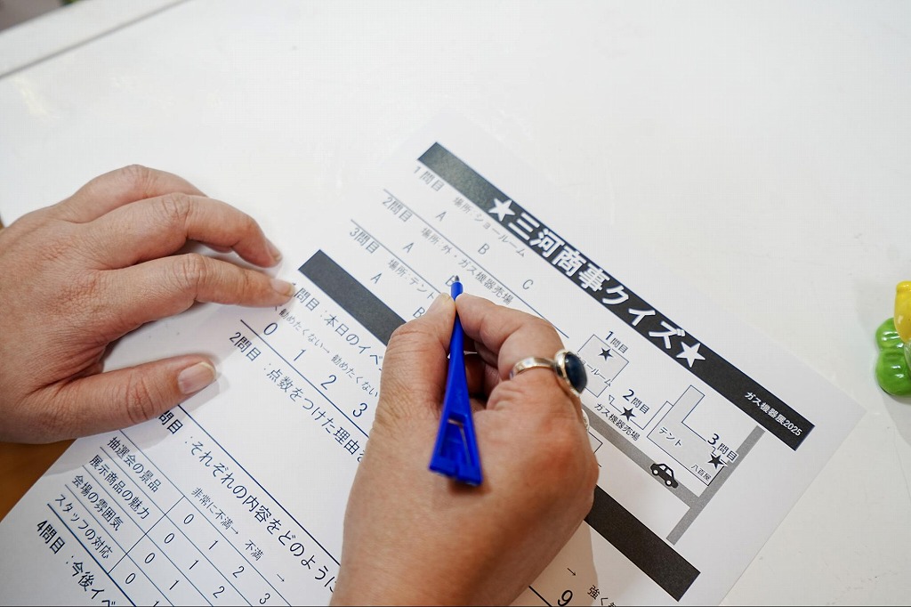 抽選会の後は、会場内に設置された三河商事クイズに挑戦!会場全体に4箇所のクイズポイントが設けられており、リフォーム相談ブースやガス機器展示コーナーなど、各ブースを巡りながら楽しく答えていくスタイルです。