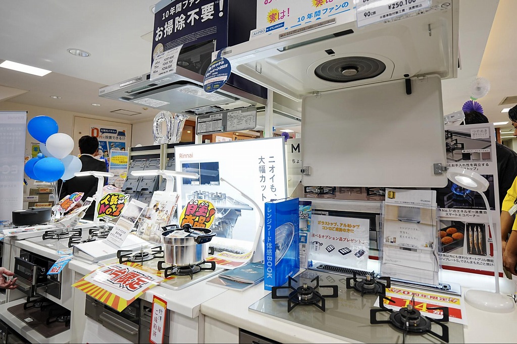 店内では、給湯器やガスコンロなど、お得な価格のガス機器がずらり。70周年限定のお得なプランも用意されており、買い替えを検討している方には見逃せないチャンスです。