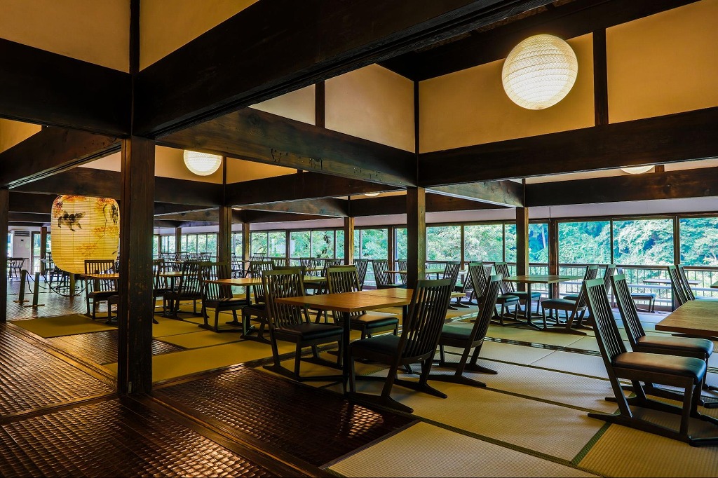 店内は、料亭の品格とダイニングの気軽さを兼ね備えた、和モダンで落ち着いた空間。窓の外には香嵐渓の豊かな自然が広がり、季節ごとに移り変わる景色が料理に彩りを添えてくれます。観光客はもちろん、地元の人々にも親しまれている癒しの食事処です。