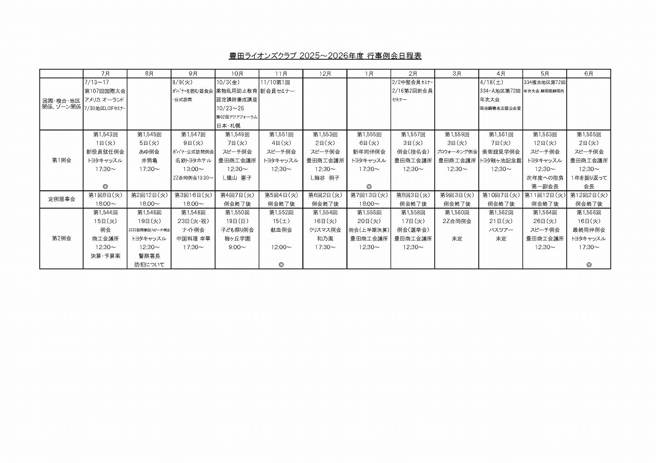 豊田ライオンズクラブ 2025 ~2026年度行事例会日程表